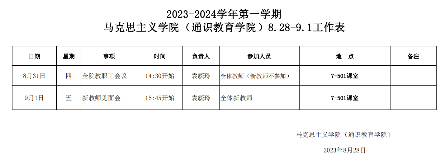 2023-2024学年第一学期伟德betvlctor1949源于英国(通识教育公司)8.28-9.1工作表