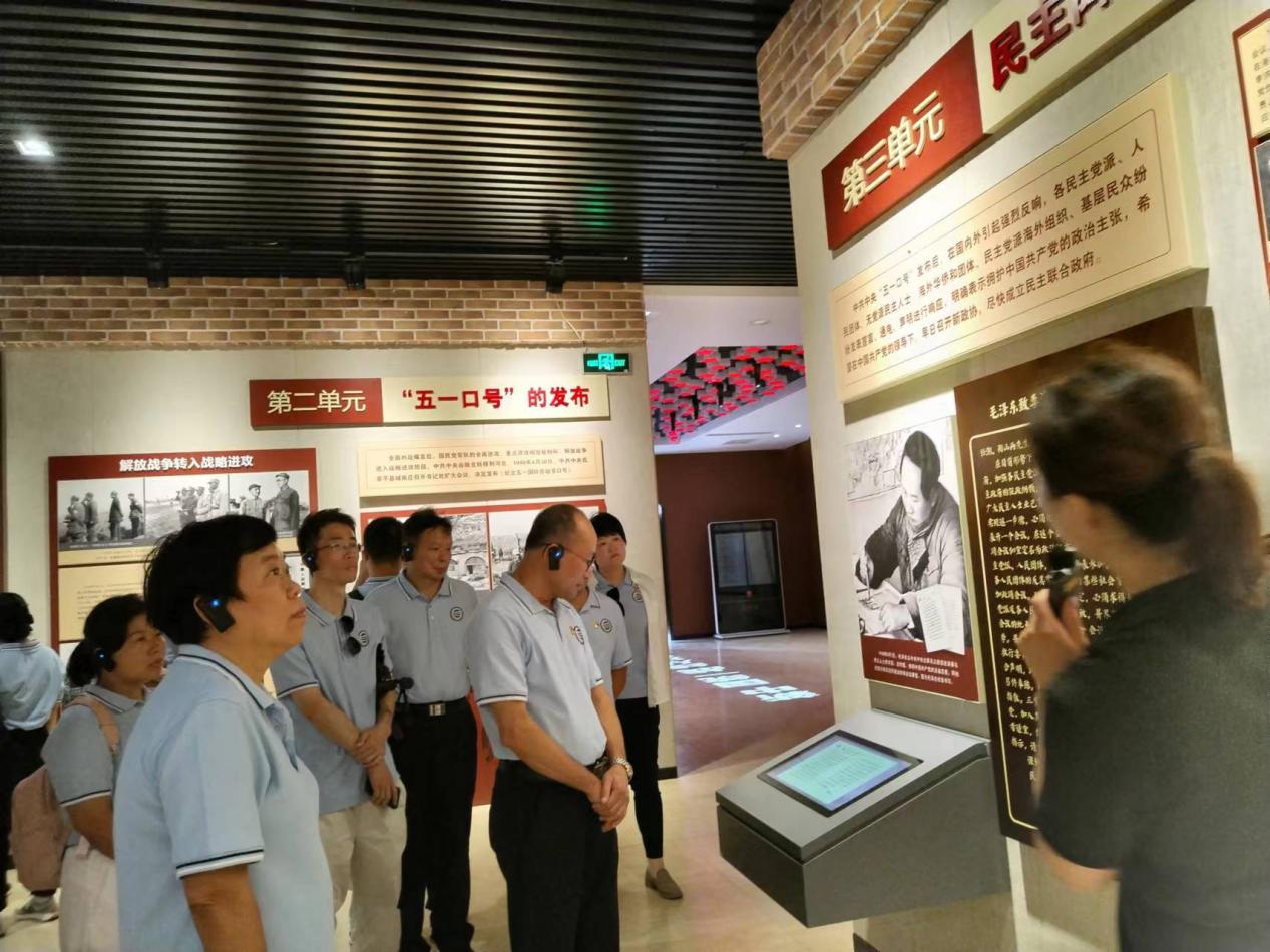 进入场馆,在地上投射的“新中国统一战线从这里走来”这几个大字吸引了大家的目光,也开启了党员同志们思想启迪的学习之路。中央统战部在李家庄的一年时间,是中国统一战线发展史上的一个非常重要的阶段,见证了各民主党派的历史选择,为新政协的召开做了大量筹备过程,孕育了中国共产党领导的多党合作和政治协商制度。据陈列馆工作人员介绍,1948年4月30日,随着解放战争转入战略进攻阶段,中共中央决定,在“五一国际劳动节到来之际”,发布“五一口号”。黄圣诚书记和袁毓玲经理在走到“毛泽东致李济深、沈钧儒的信”这一展区时,驻足仔细阅读,感受先辈们在建国史上留下的深刻印记。中共中央“五一口号”发布后,在国内外得到了激烈反响,各民主党派人士、人民团体、无党派人士等纷纷响应,例如:李济深、沈钧儒等12名民主人士联名响应中共中央“五一口号”的通电,明确表示拥护中国共产党的主张。“五一口号”,仿若一颗明星,在中国统一战线发展的光辉历程中熠熠生辉。