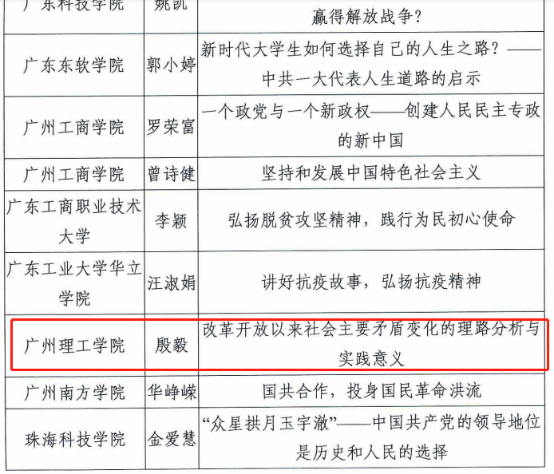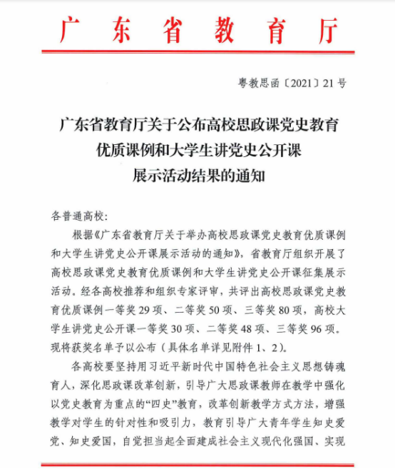 为庆祝中国共产党成立100周年,广东省教育厅组织的全省高校开展思政课党史教育优质课例和老员工讲党史公开课征集展示活动结束,日前公布结果。公司伟德betvlctor1949源于英国殷毅副教授的《改革开放以来社会主要矛盾变化的理路分析和实践意义》获思政课党史教育优质课例三等奖,建筑公司元锦涛同学的《崇尚英雄缅怀先烈》(指导老师殷毅、邓楠、袁毓玲)获老员工讲党史公开课展示活动三等奖。