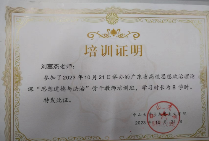 刘富杰老师参加“思想道德与法治”课骨干教师培训获培训证书